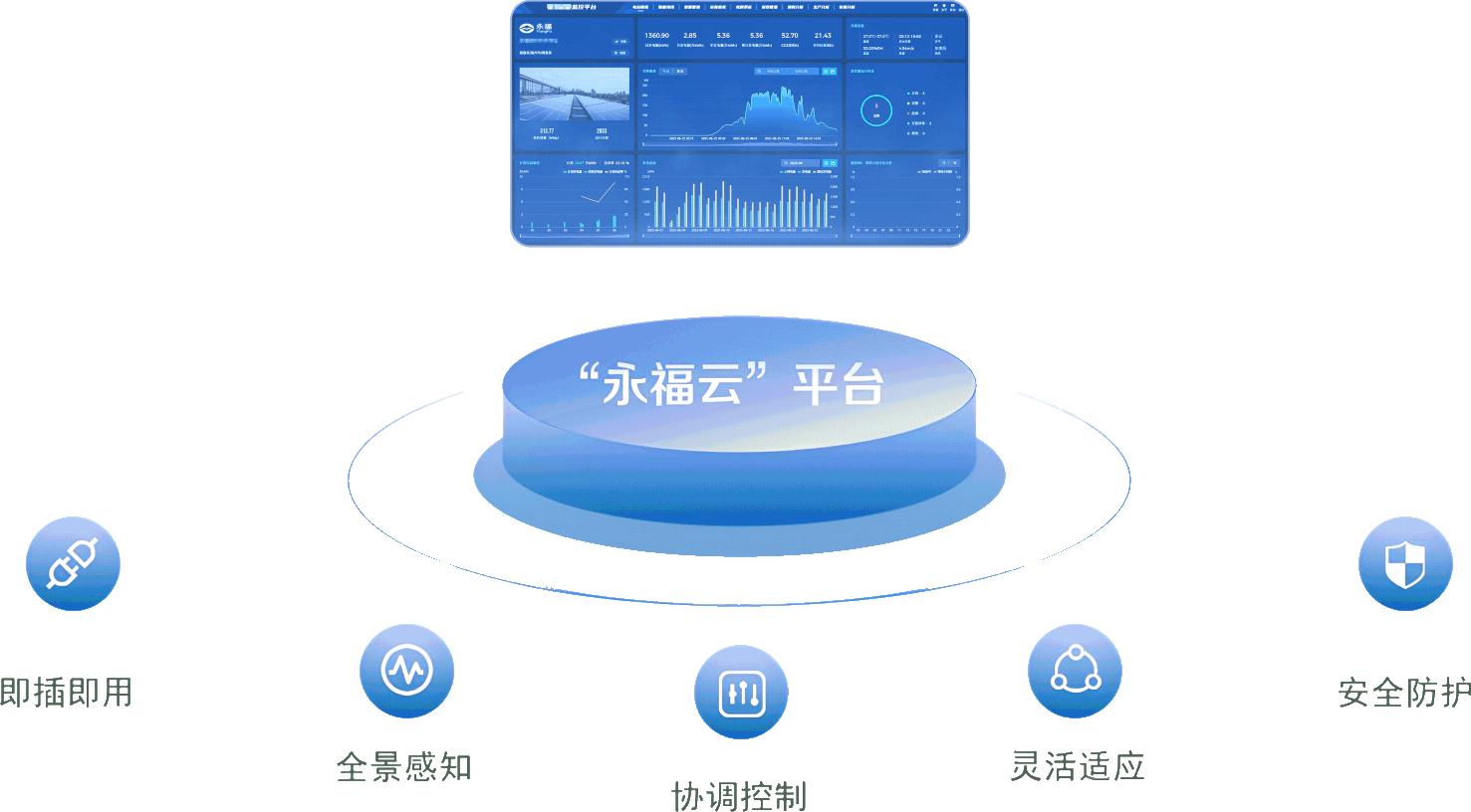 云边协同智慧光储大数据平台——“永福云”,是永福数能专为分布式光伏与储能电站打造的新一代智慧能源管理平台。该平台依托“云-边-端”协同创新架构,突破行业技术瓶颈,构建了五大核心能力,包括分布式场景“即插即用”快速接入、多能网络“全景感知”实时监测、“源网荷储”协调控制、多集成商方案灵活适配,以及新能源信息化全栈安全防护,为电站高效运营提供全方位支持,显著提升了管理效率与系统可靠性。