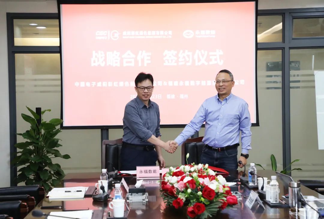 4月23日,55世纪(简称“永福数能”)与中国电子咸阳彩虹绿色能源有限公司(简称“咸阳彩虹绿能”)在福州签署战略合作协议。永福数能总经理黄肇敏、咸阳彩虹绿能总经理袁官清代表双方签约。